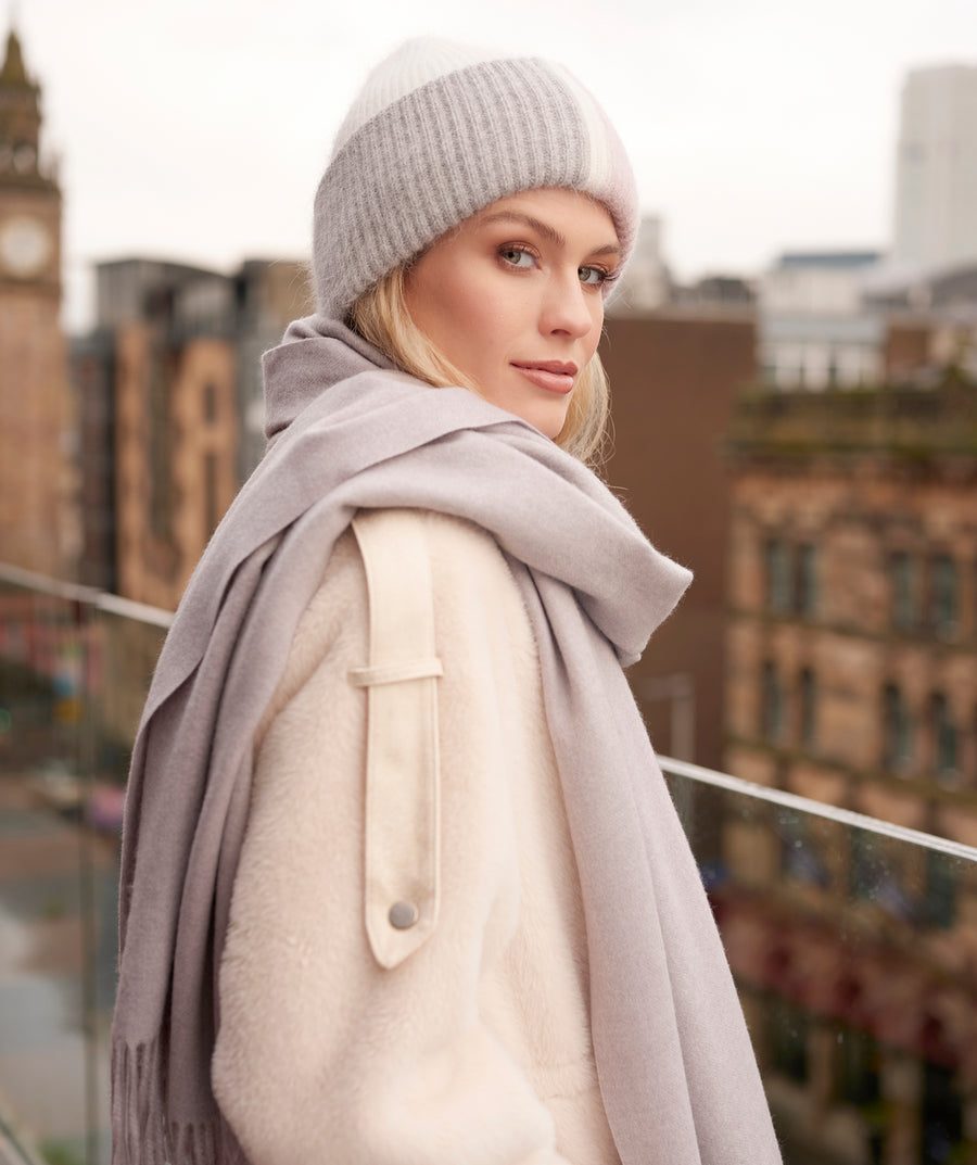 Stay chic and cozy with our cream Lucy Hat. This chunky knit beanie features a wide folded brim and subtle striped design, adding a touch of femininity to any outfit.. Designed in a one size fits all, this hat is not only fashionable but also practical, making it a must-have accessory for the colder seasons.