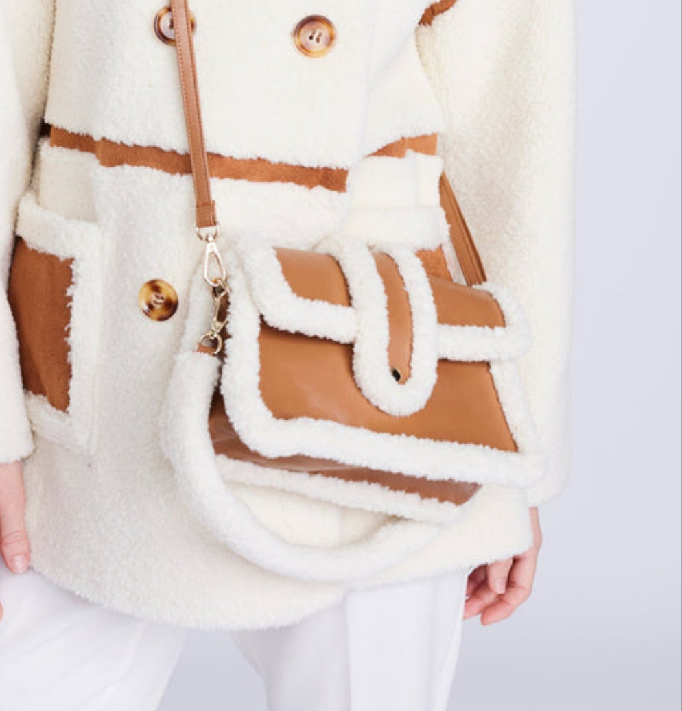 Cream/Tan Faux Fur Crossbody Bag with Button Closure