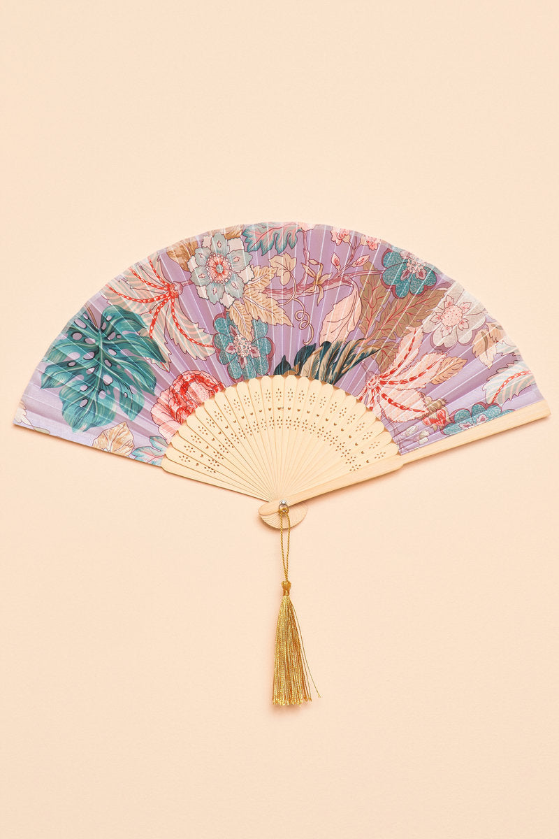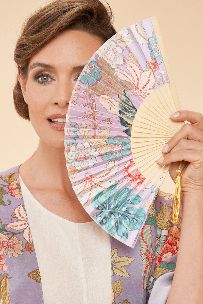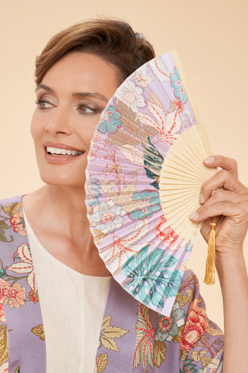 Inspired by tapestries, this Lavender Paisley Satin Fan is perfect for lovers of ornate design and everyday luxuries! Pastel tones combined with florals are sure to elevate every fashionistas capsule wardrobe. This fan is sure to have travel and fashion lovers swooning. Bring down to evening drinks or by the pool, effortlessly channelling your inner Hollywood starlet. Style with our Prancing Tiger Kimono Gown for a fashionistas dream pairing. Go on, treat yourself!