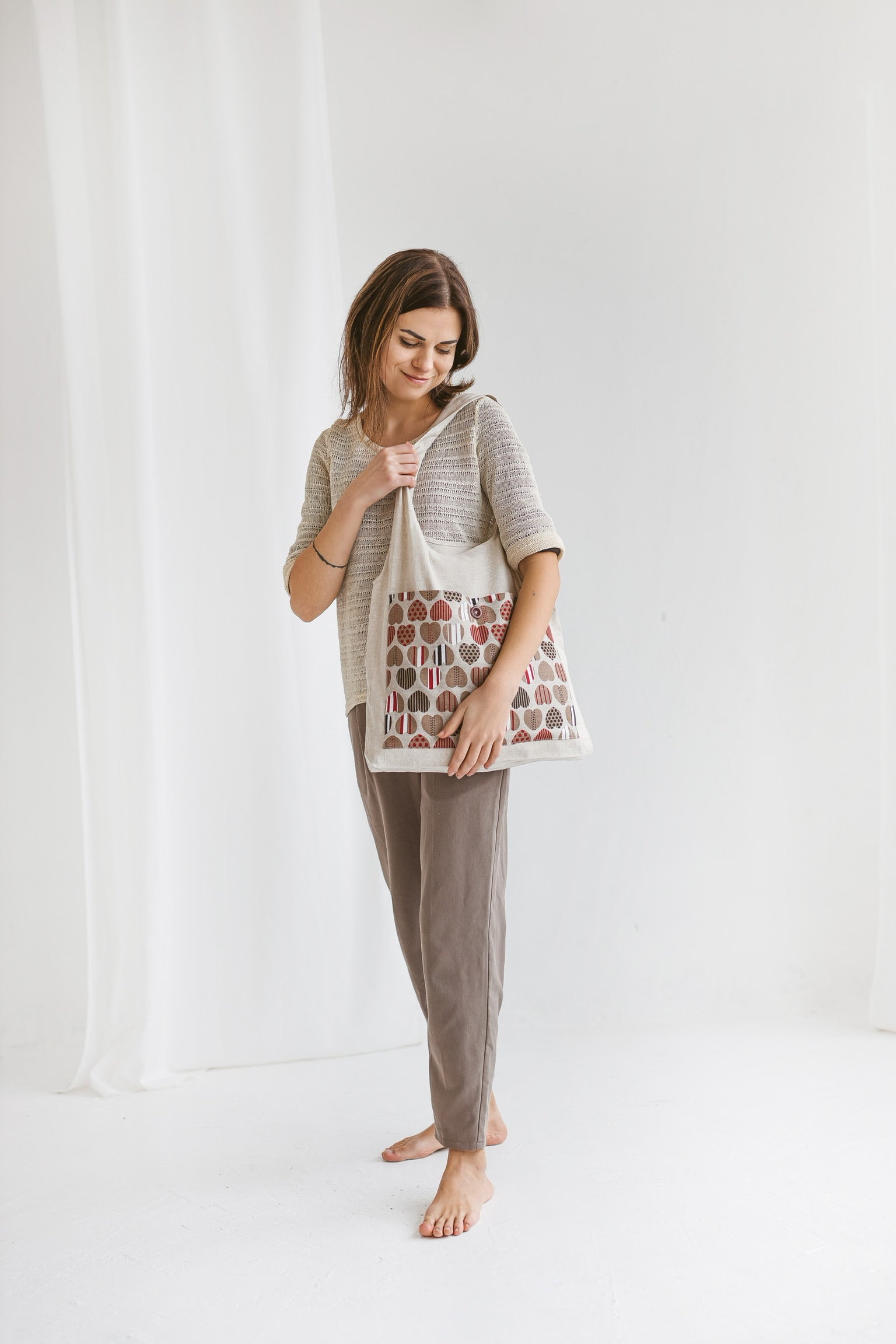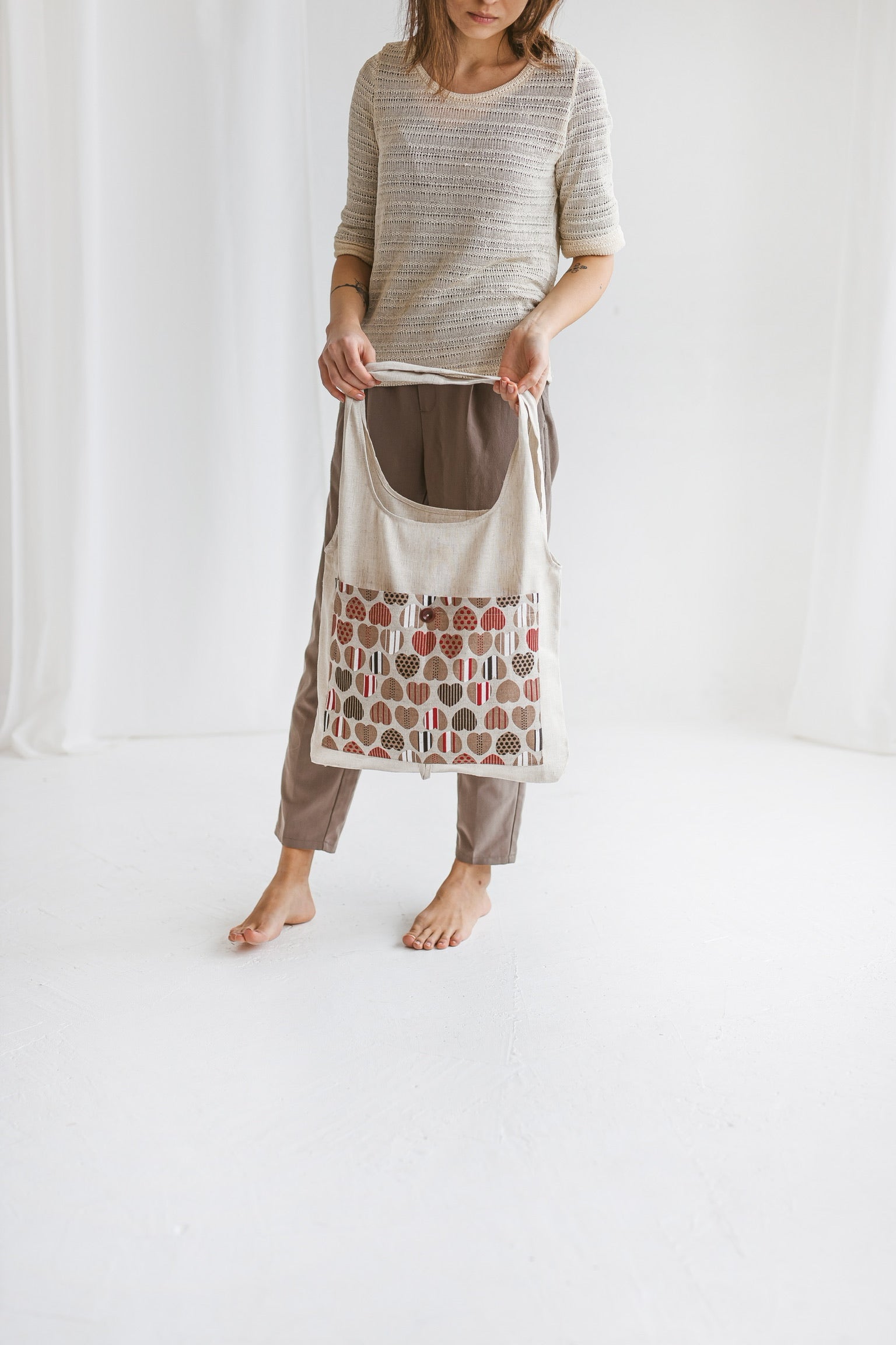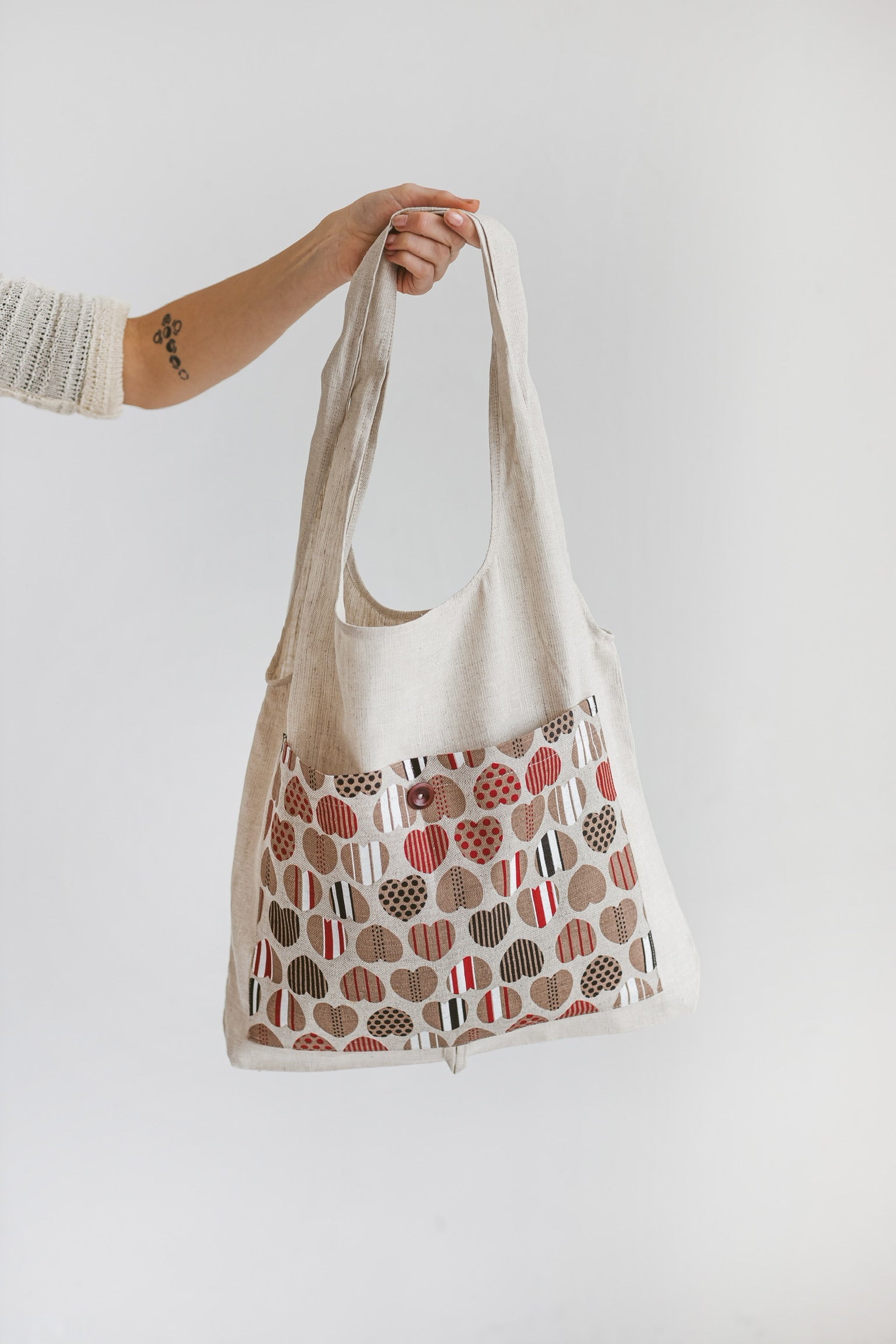 Linen Reusable Shopping Bag • Foldable Tote with Hearts by SaVa Seasons