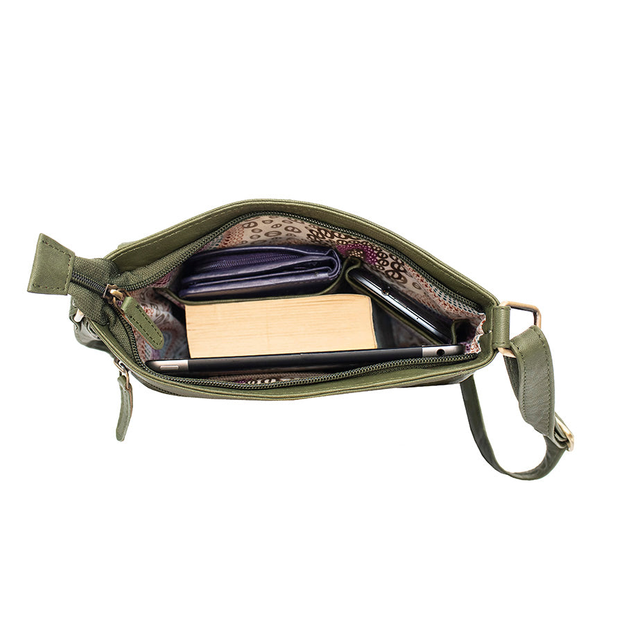 Perfect everyday handbag, front compartment with flap for easy access, roomy centre section with zipped closure and inner pockets and secure zipped pocket at rear. All sections are lined with soft colourful cotton fabric. Adjustable strap.