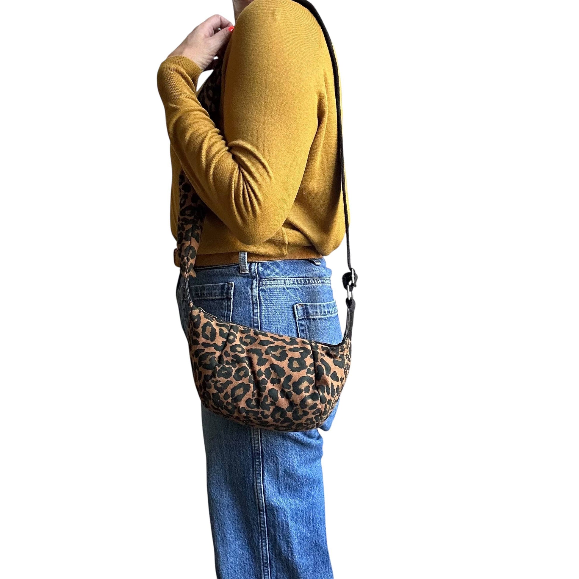 A super small version of Sixton's best selling Brixton, cross body style sling bag in a striking brown leopard print, made from water resistant, recycled cotton canvas.