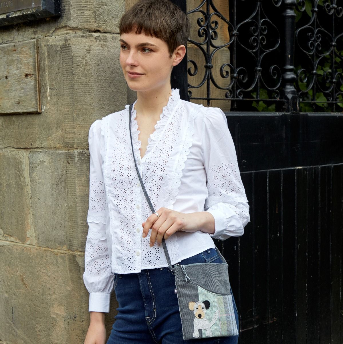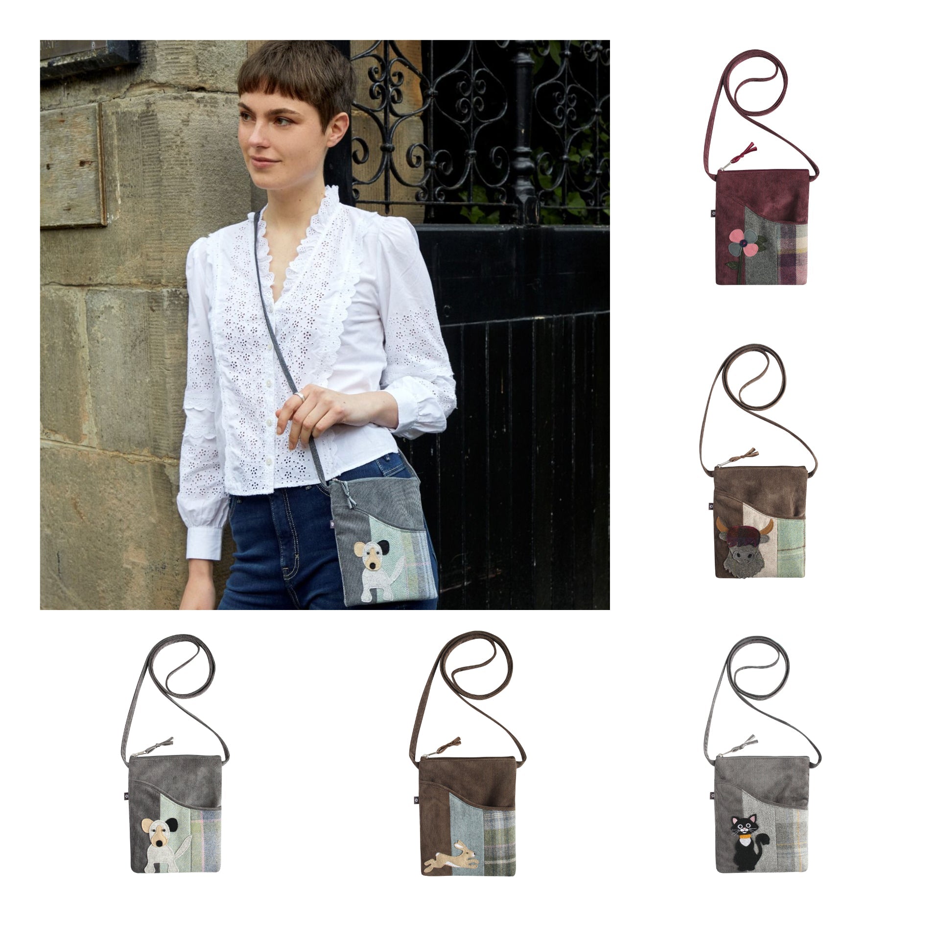 TWEED APPLIQUE SLING BAG by Earth Squared. Fun and funky little Cross Body Bag with animal or floral appliqué detail. Beautiful soft tweed and corduroy fabric. Zipped secure inner section with satin lining and slip pocket at front. Perfect gift for friends or family.